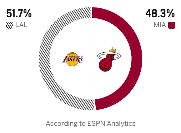 今天,ESPN预测本场比赛胜率,湖人51.7%,热火48.3%。